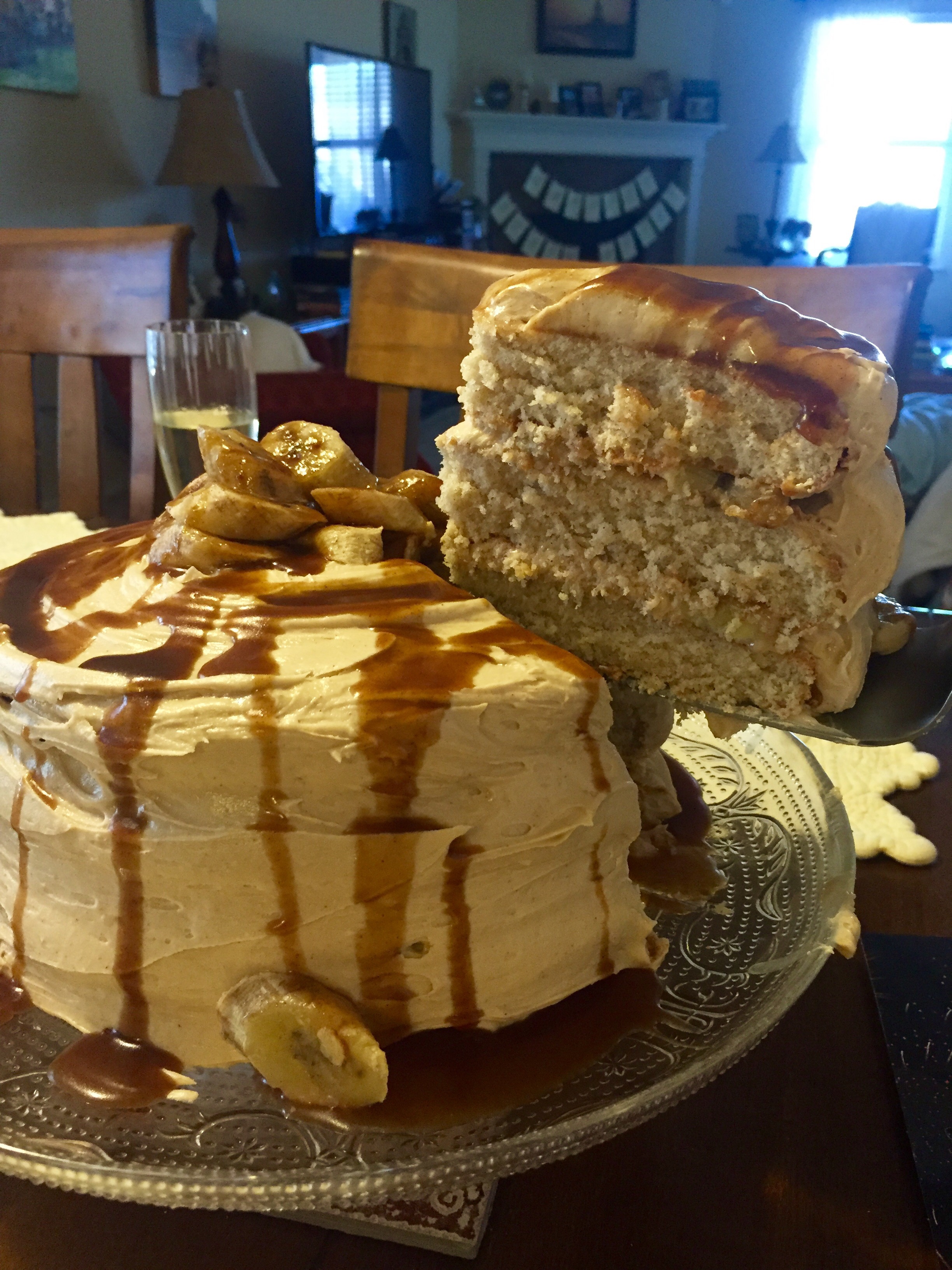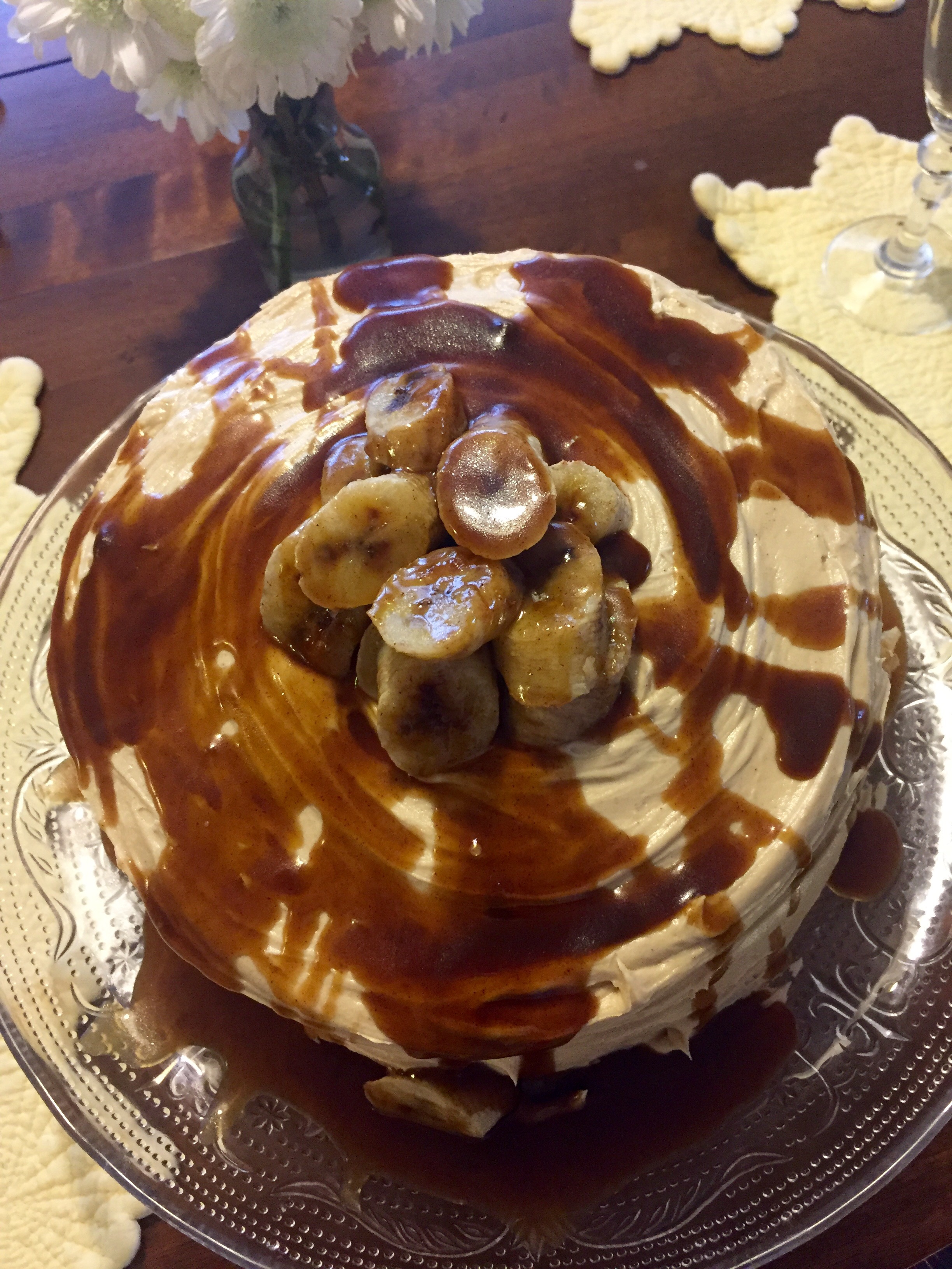 - Layer cinnamon cake, bananas foster frosting, and flambéed bananas.