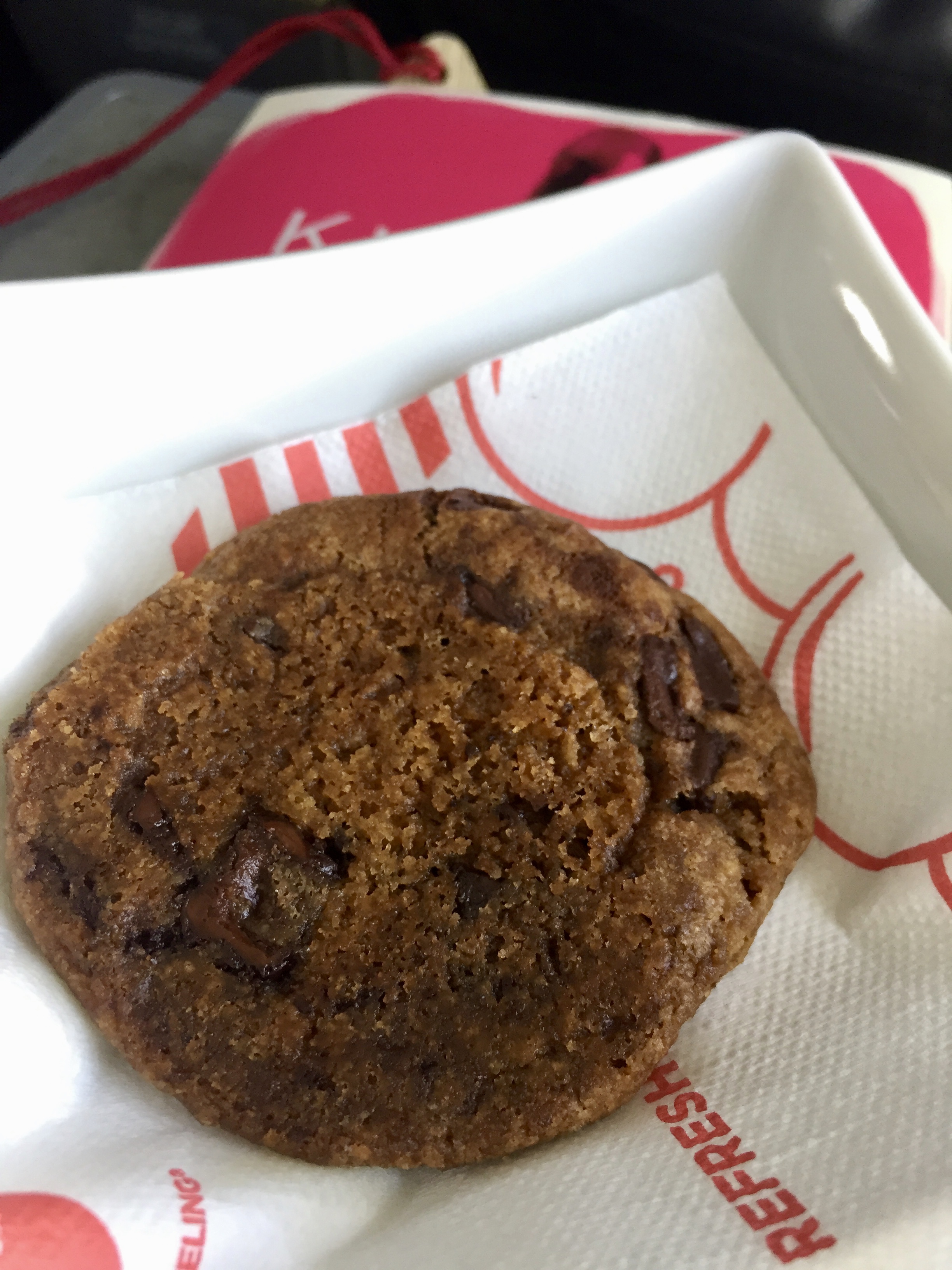 I told Sarah on our last night, “This is the first time in my entire life that I’ve not dreaded traveling.” Does anyone else do that? On your last night, you stress out about your flight because, well, the actual traveling to and from your vacation is not fun. Or so I thought. We were genuinely excited to board the plane again knowing we were flying first class. Our return flight left sometime in the afternoon. This was actually a business class flight, as there was no first class on this particular plane. For lunch I opted for the pasta option, which came with a side salad (Greek!) and your choice of a roll. We felt very chic with our cloth napkins, wine, and warm cookies and caught up on magazine trends on our way to Florida.