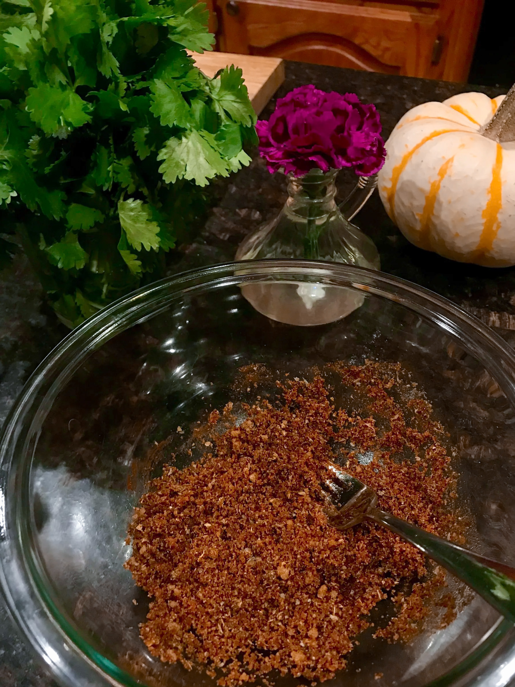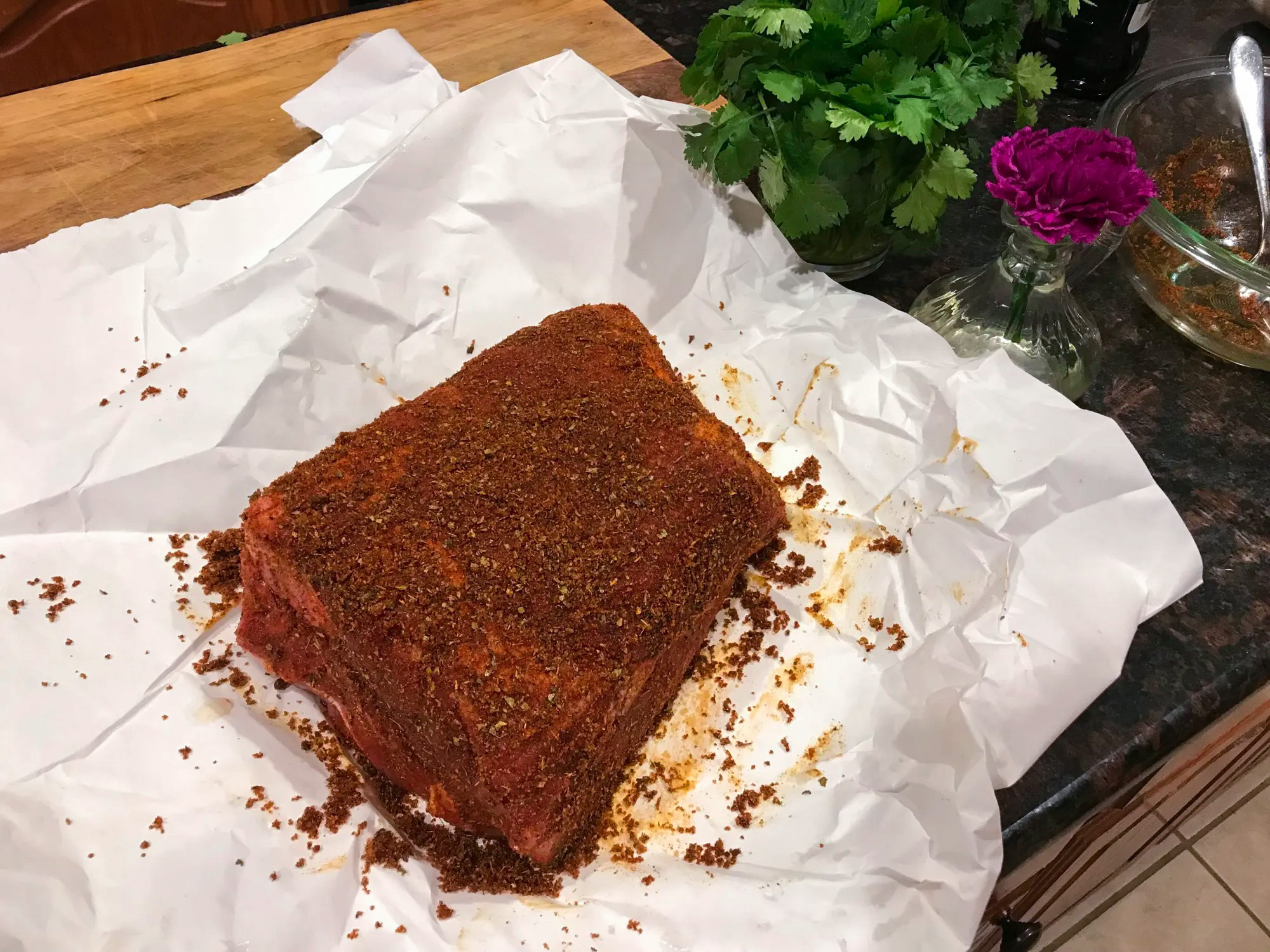My rub is a mixture of brown sugar, paprika, cumin, salt, pepper, oregano, and a little olive oil to bind it together. The rub takes just a few minutes to whisk together and pat on the pork shoulder.