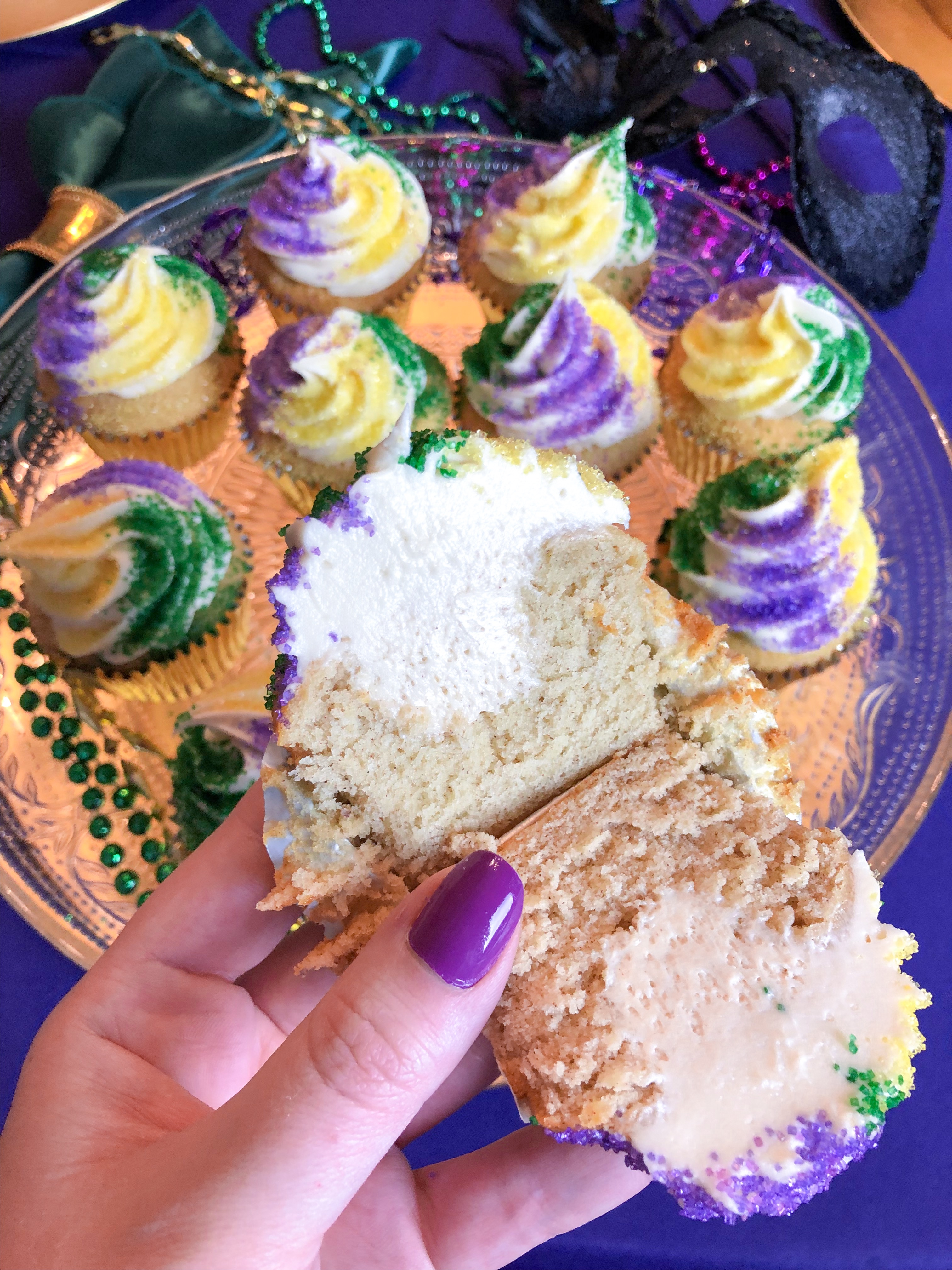 First of all, what is a king cake? A king cake is a cinnamon bread pastry associated with the Mardi Gras season that’s shaped like a wreath and often filled with something (fruit, chocolate, cream cheese), and topped with a sweet glaze and Mardi Gras-colored sprinkles. A plastic baby is traditionally hidden inside. (I did not hide a baby in the cupcakes because I think that’s a chocking hazard.)