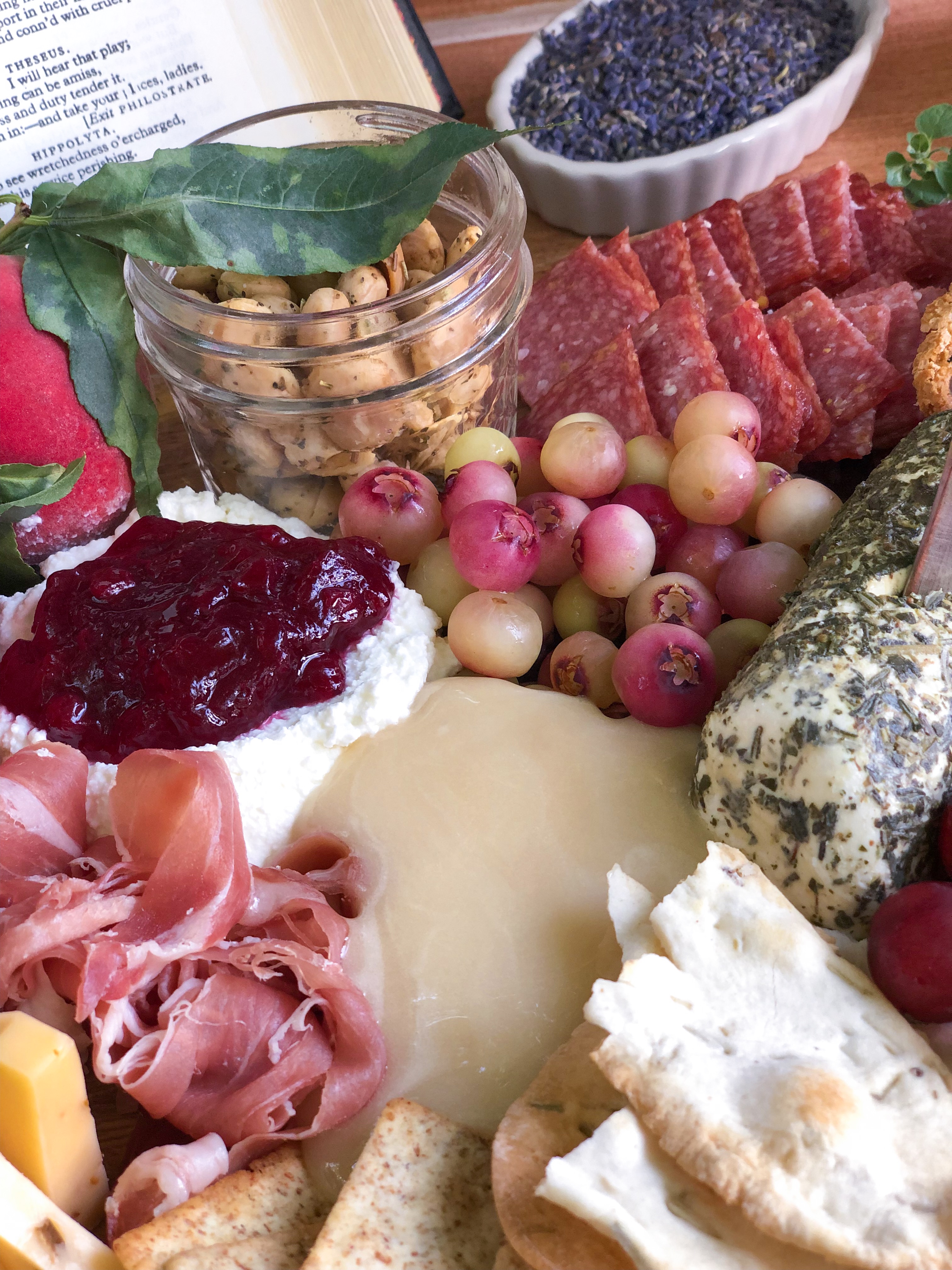 This board consists of herbed goat cheese, an English cheddar (since Shakespeare is English), a spicy three-pepper gouda, ricotta with lingonberry jam, marscapone with sour cherry jam (there’s another cherry element!), Mustardseed salami (which, of course, is for the fairy Mustardseed), and prosciutto.