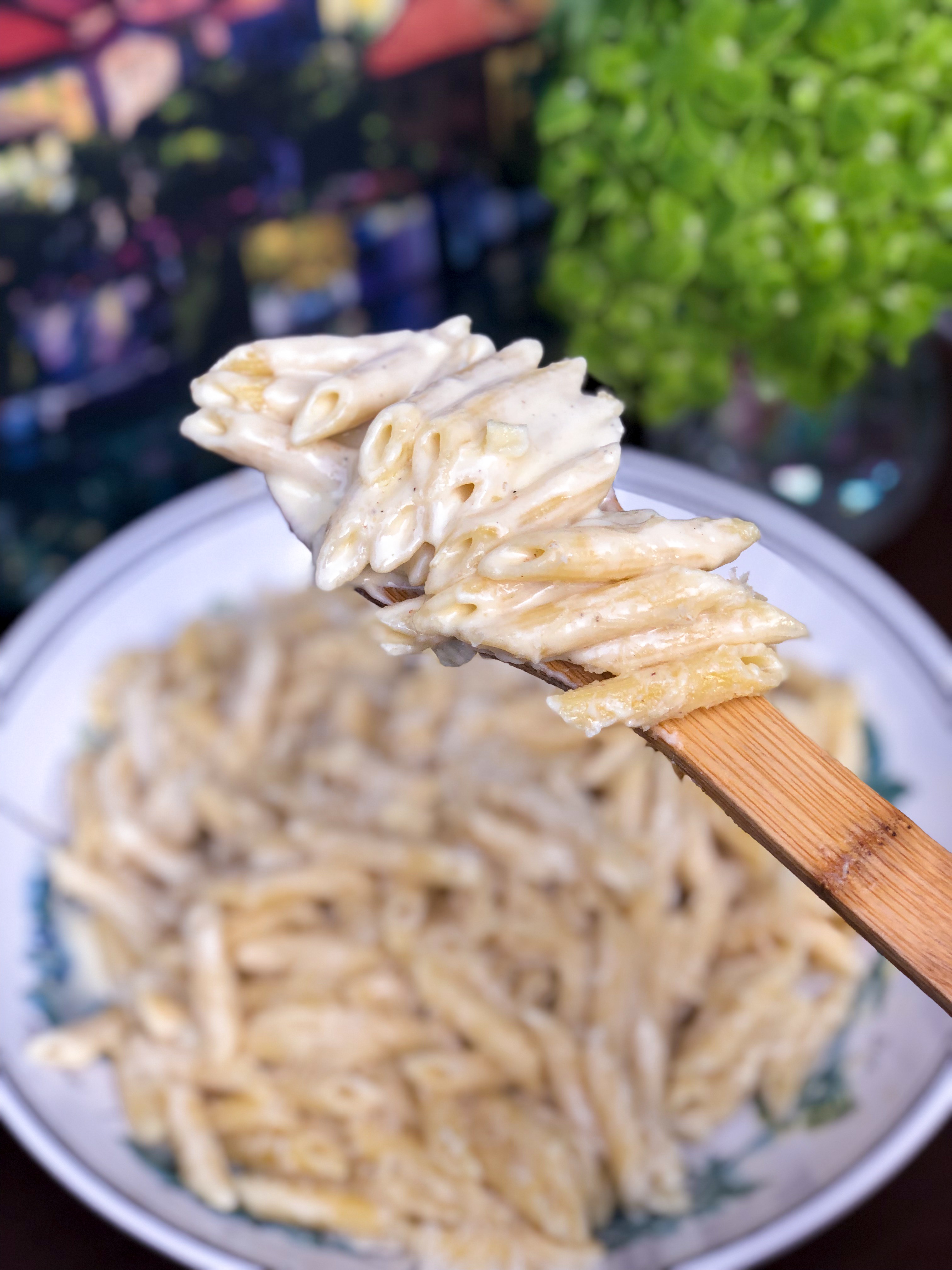 - Grate fresh nutmeg into the sauce, whisk, and add a pound of cooked penne pasta, using tongs to carefully coat the noodles with the sauce. Serve immediately.