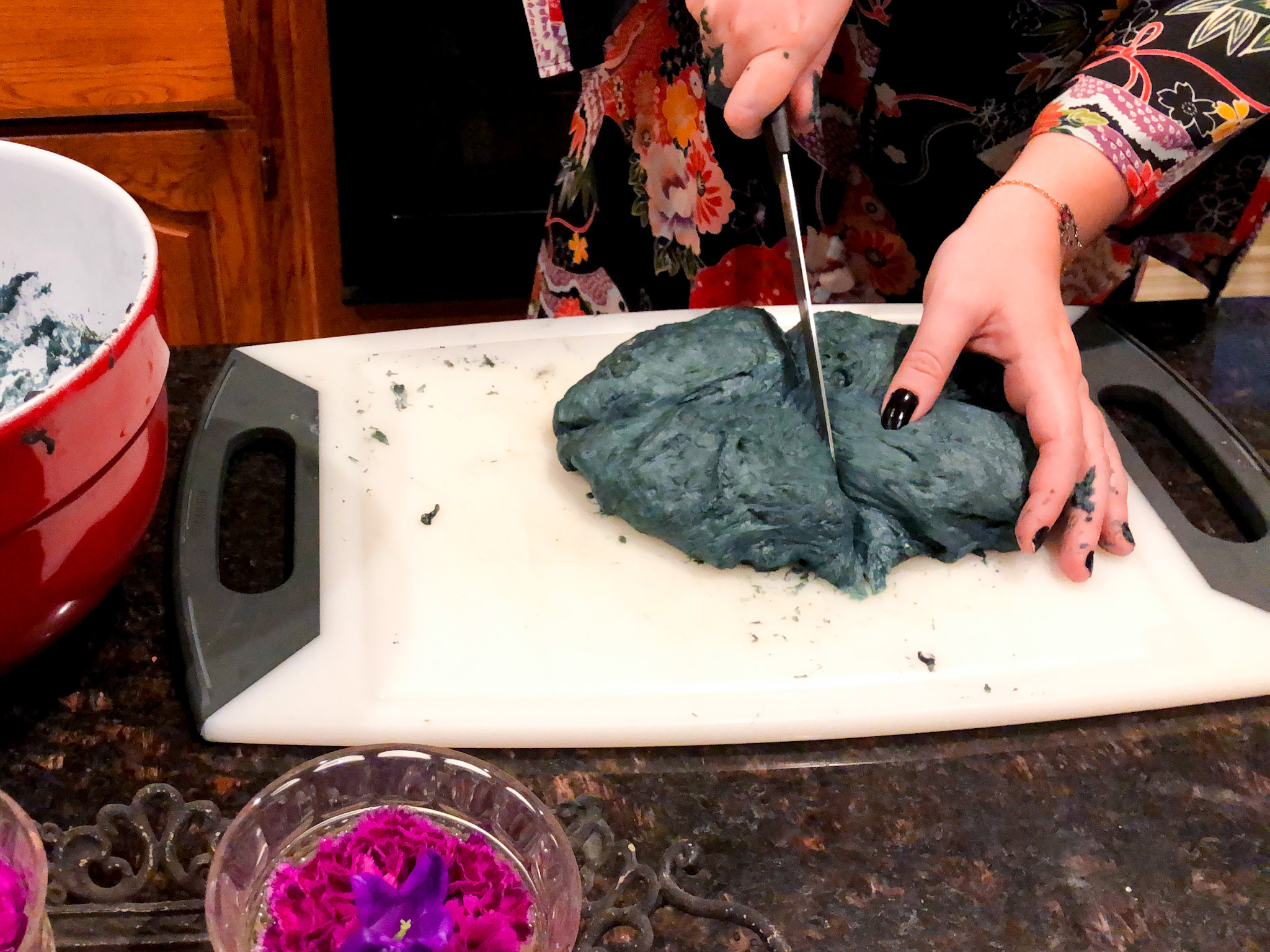 2. Whisk black food coloring into warm milk. Add yeast mixture to flour mixture along with two beaten eggs and warm black milk and mix it all together. Knead in melted butter until dough is smooth. Cover bowl with a clean towel and set in a warm place to rise for one or two hours or until dough has doubled in size.