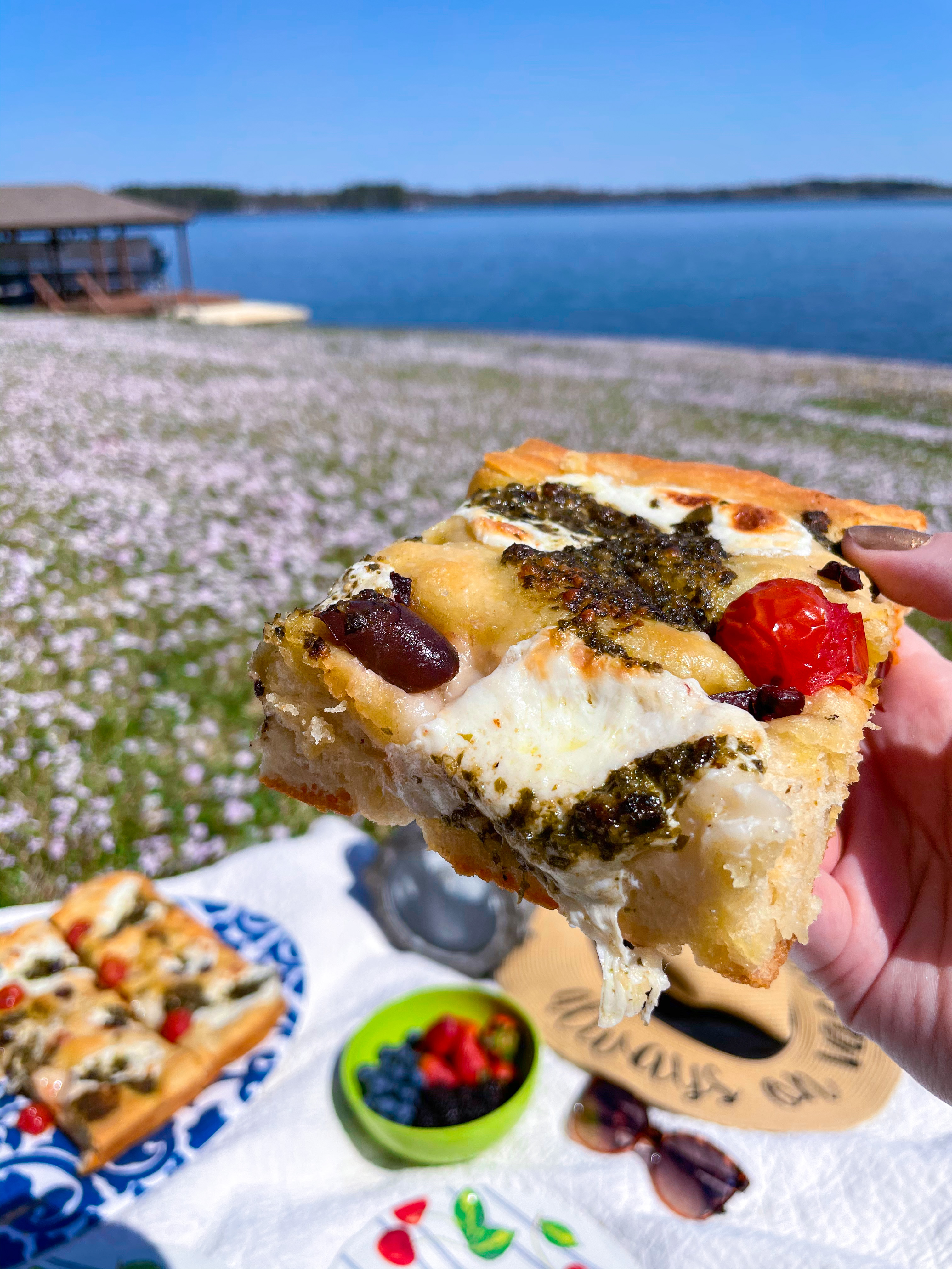 I made this for lunch for mom and myself at her lake house. To feel even more like we were on a chic Italian vacation, we ate this on a picnic blanket down by the water. Note: if I was serving this with dinner, I’d cut it into much smaller slices but since this was for lunch, I cut the focaccia into eight large slices to eat like an open-faced sandwich. Yum!