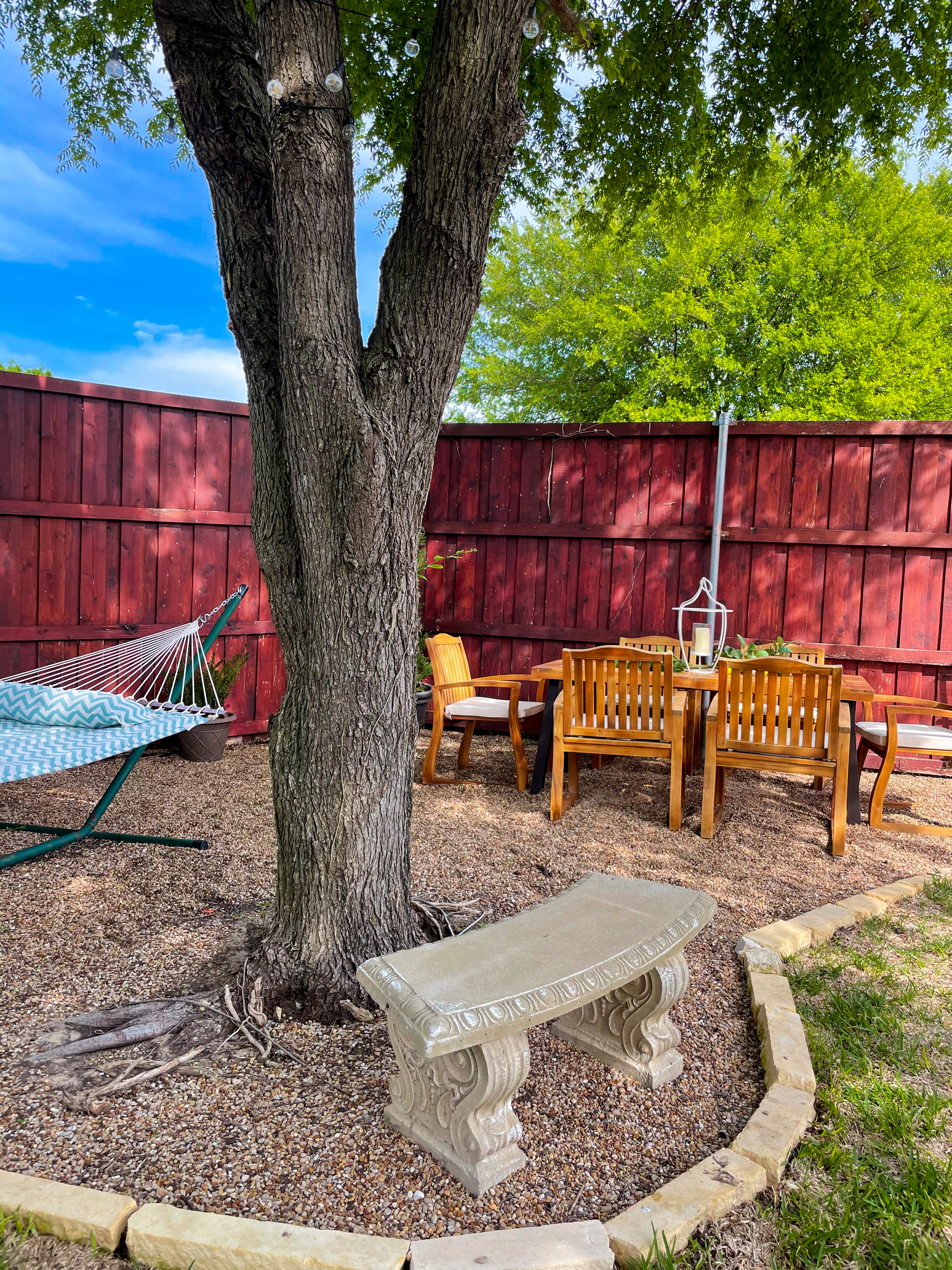HUGE thank you for my dad for building this patio with me! I furnished the patio with a new hammock and a gorgeous six person teak dining set from Lowe’s. I added some potted plants, a concrete bench I’ve had for a decade nestled in the rounded area in front of the tree, and I (okay, dad) strung solar lights between the trees.