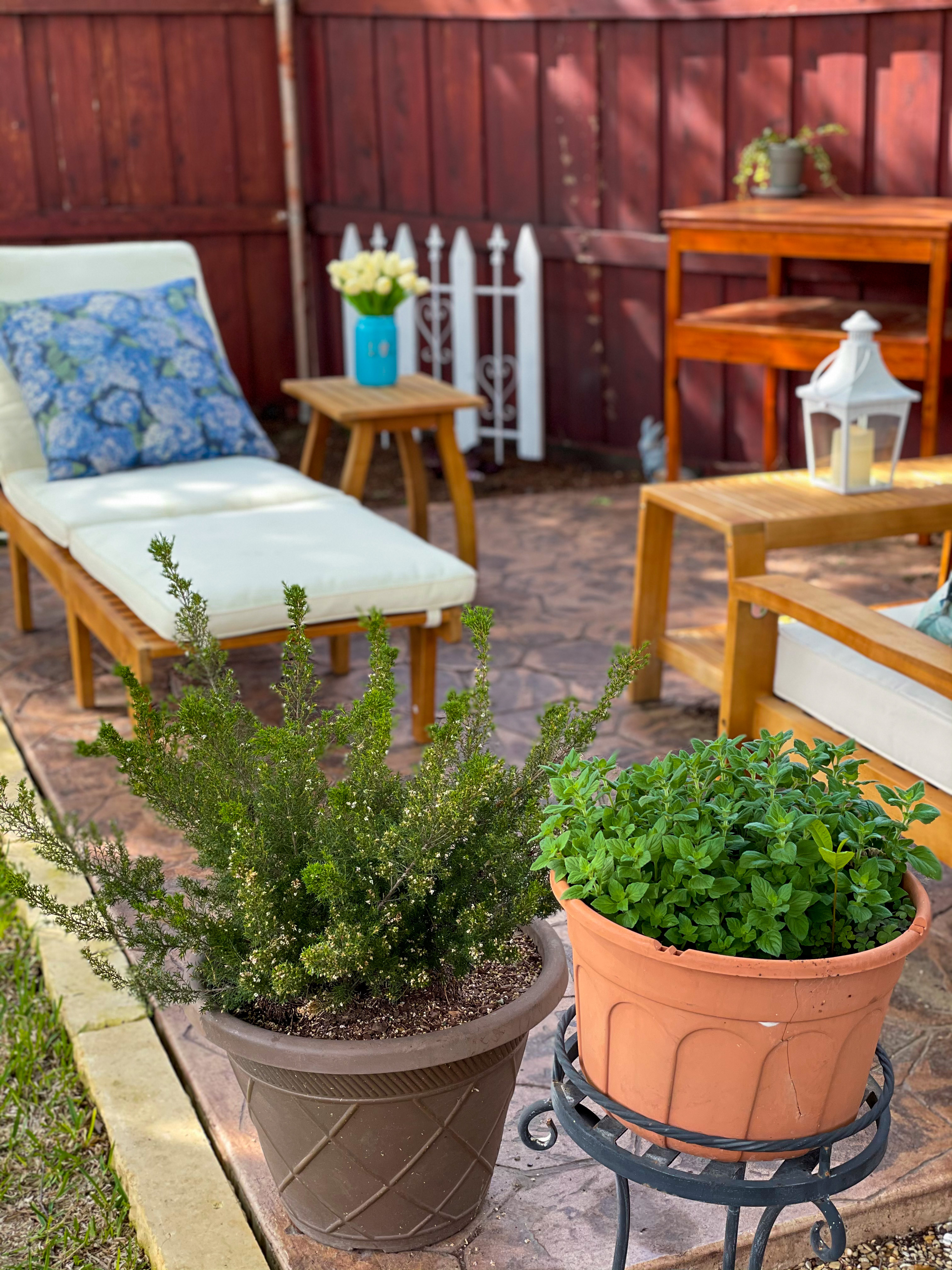 The dining set matches the new teak chaise, love seat, and coffee table that I got for my stamped concrete patio last fall, which I think really ties the whole yard together. Here are some more photos of my refurbished backyard!